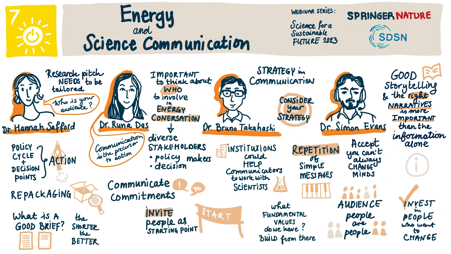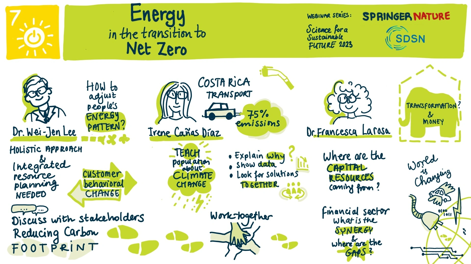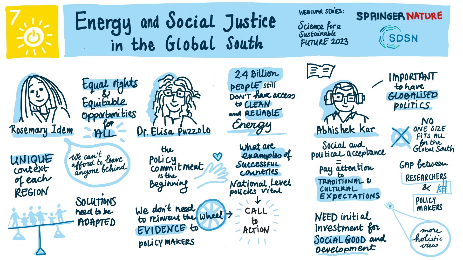 Science for a Sustainable Future is a joint initiative of the United Nations Sustainable Development Solutions Network (UN SDSN) and SSCI Journal Indexing. In April 2023 we co-hosted three webinars focusing on energy (SDG 7). In this blog we cover some of the highlights and learnings from the webinars. Below you can also find a summary illustration of each session: