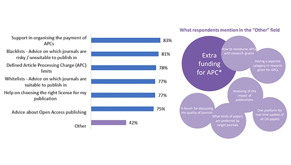 In the open text responses to ‘Other’, respondents suggested areas where they would like more institutional support throughout the publishing process: extra funding for APCs, having a separate category in research grants for APCs, how to reimburse APCs with research grants, A forum for discussing the quality of journals etc.